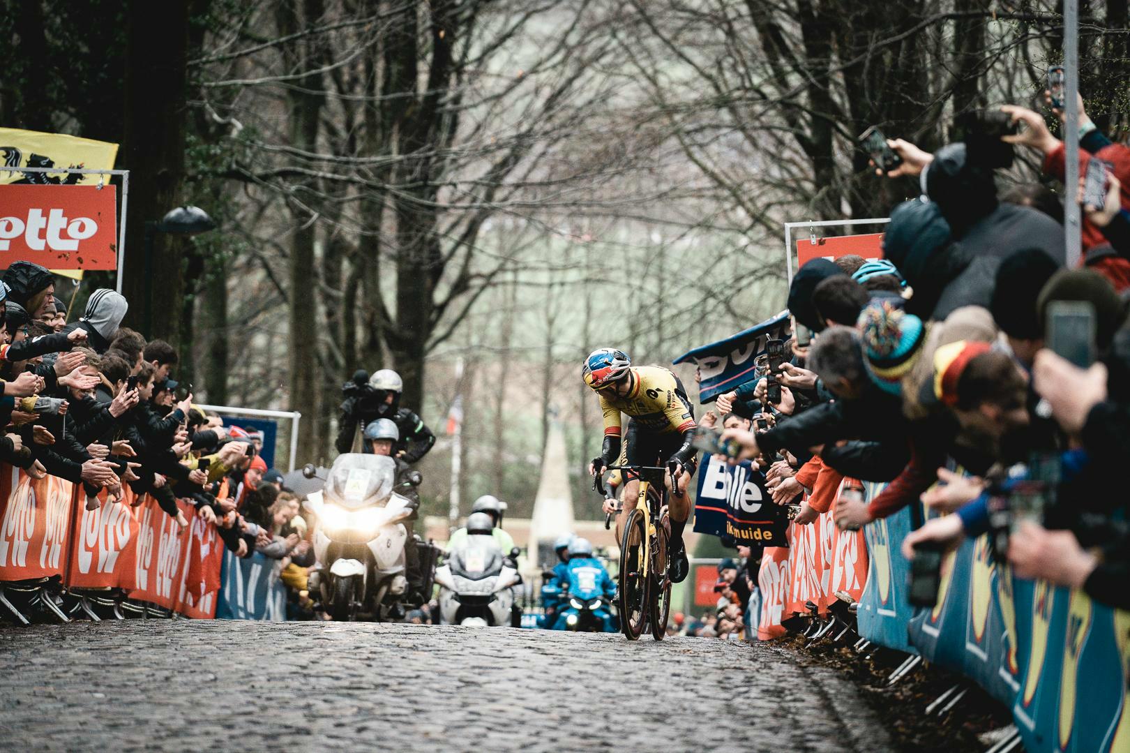 Dans la deuxième ascension du mont Kemmel, le favori Van Aert (Jumbo-Visma) accéléra à son tour. Seul son coéquipier Laporte fut capable de le suivre. S’ensuivit un véritable contre-la-montre en direction de Wevelgem. Dans la troisième et dernière ascension du mont Kemmel, Van Aert voulut tester ses jambes. Son coéquipier Laporte dut céder quelques mètres mais put revenir au sommet.